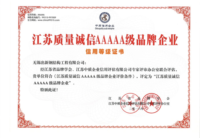 2016江蘇質量誠信5A品牌企業